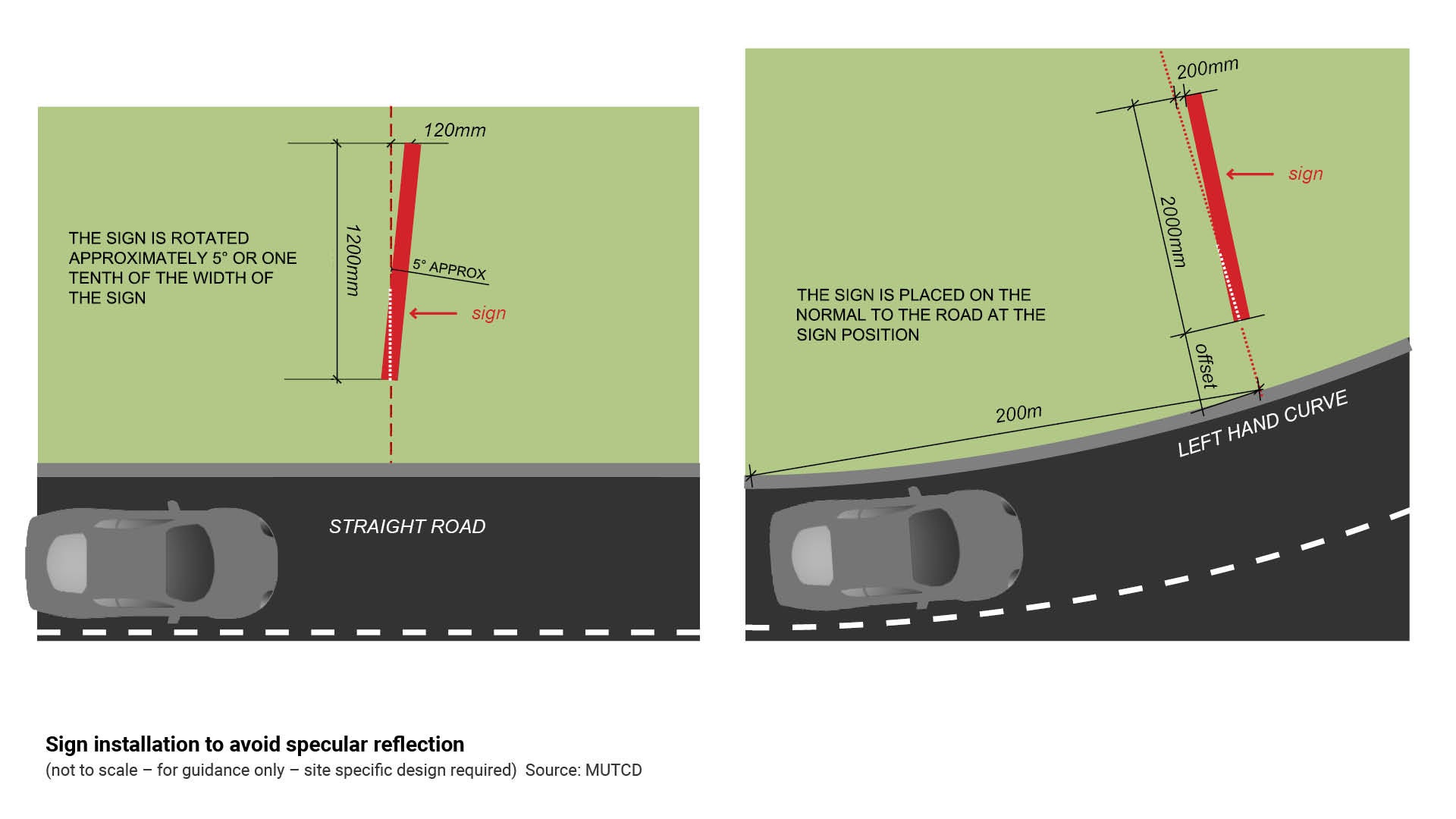 - To avoid specular reflection from a sign viewed by motorists, ensure that the sign is positioned as per MUTCD Part 1: General Introduction and Sign Illustrations.