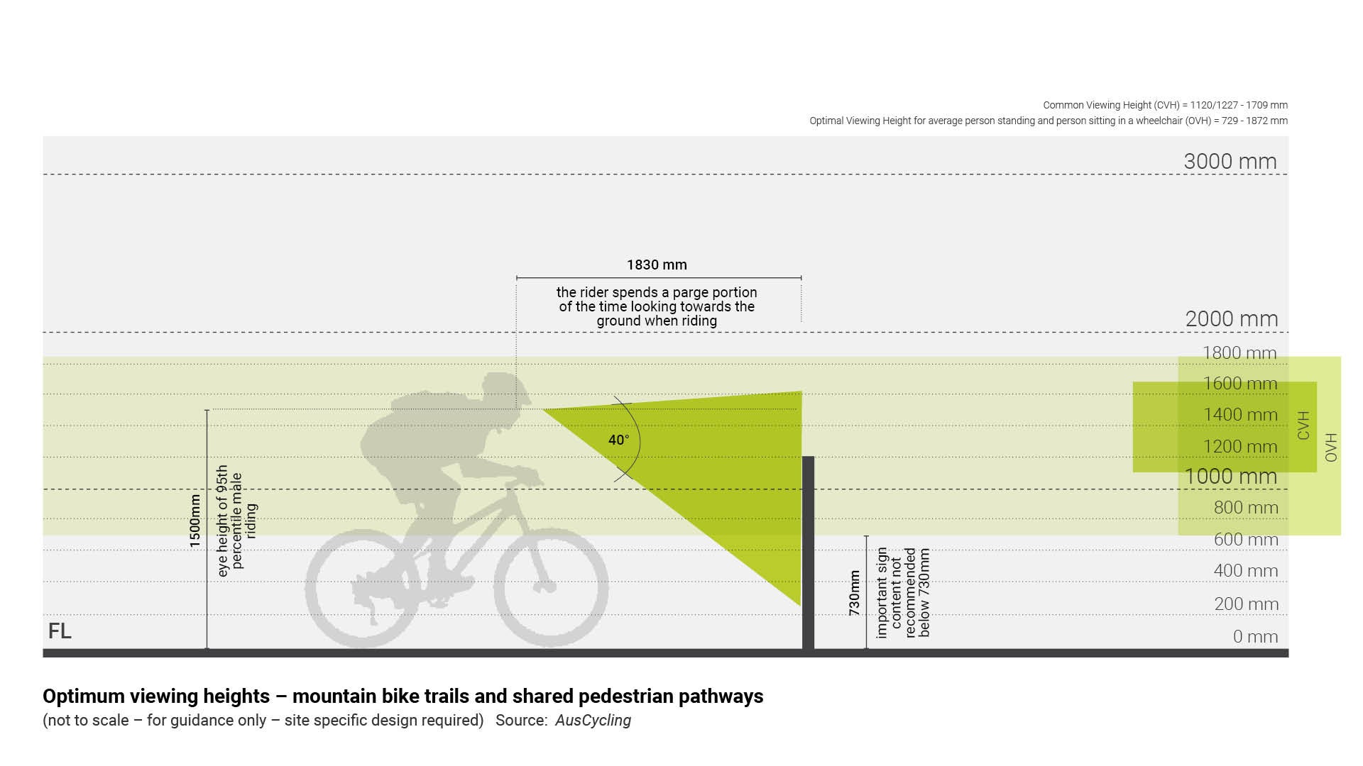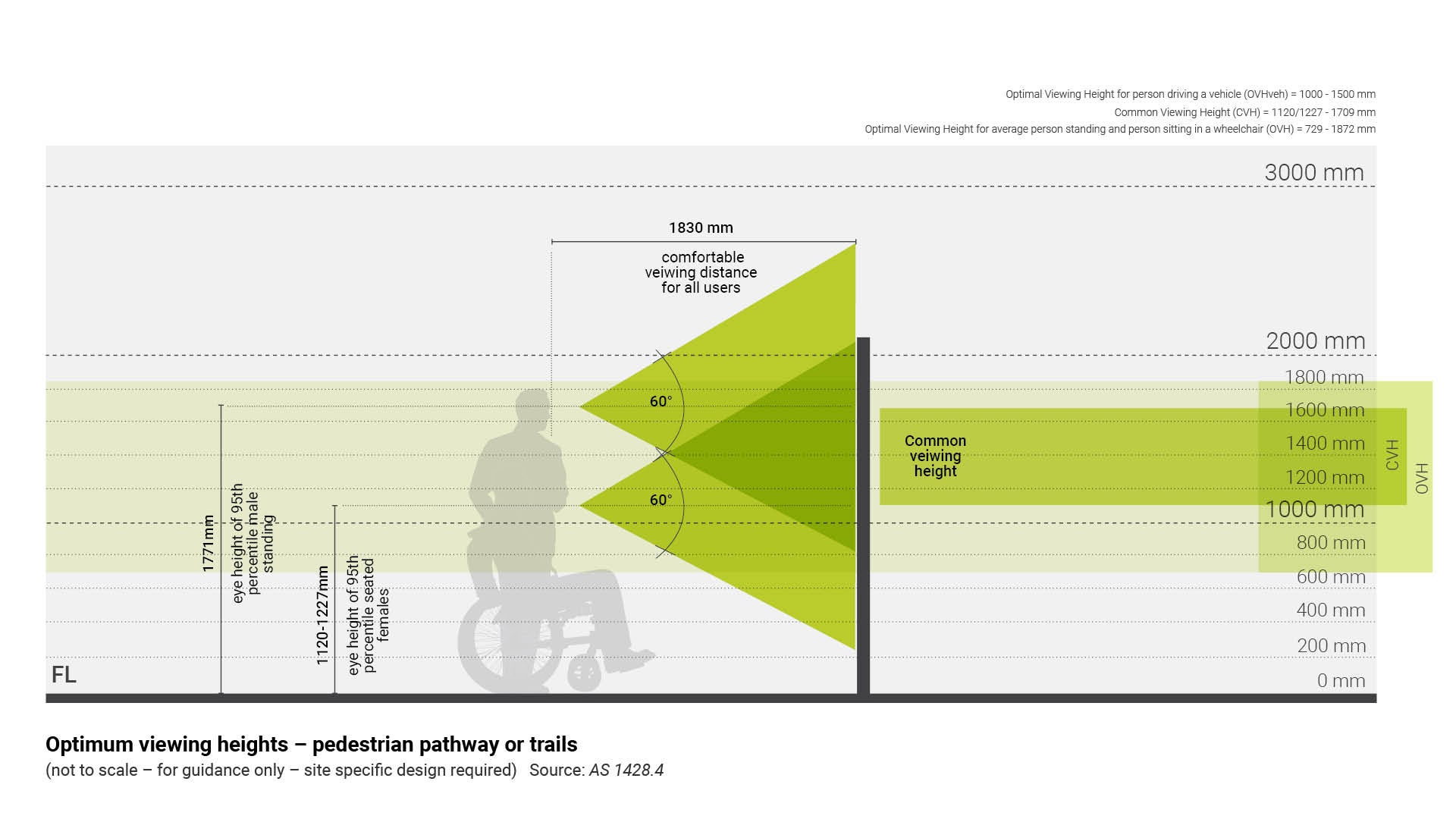 - AS 1428.4.2:2018 requires signs to be positioned so that the message/sign face is at a comfortable viewing height for all pedestrians (includes people in wheelchairs or other mobility devices) of between 1.2 m – 1.7 m from the finished surface level. This Standard excludes mountain bike riders, horse riders and canoe/kayak users.