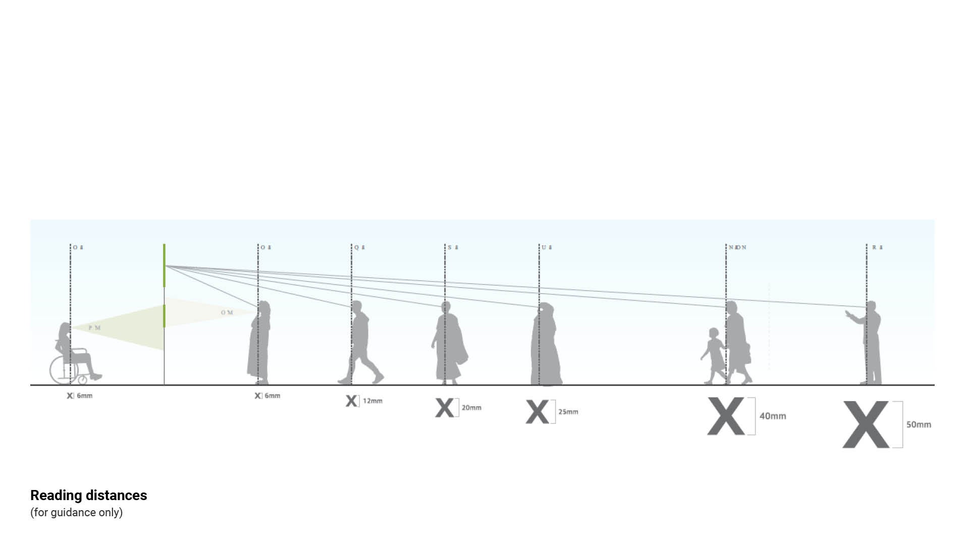 Source: AS 1428 set – Design for access and mobility. For further guidance for letter heights for different situations, refer AS 1428.2 - 17 Signs 1992. Accredited access consultant advice recommends 6.0 mm letter height from a viewing distance of 2.0 m.