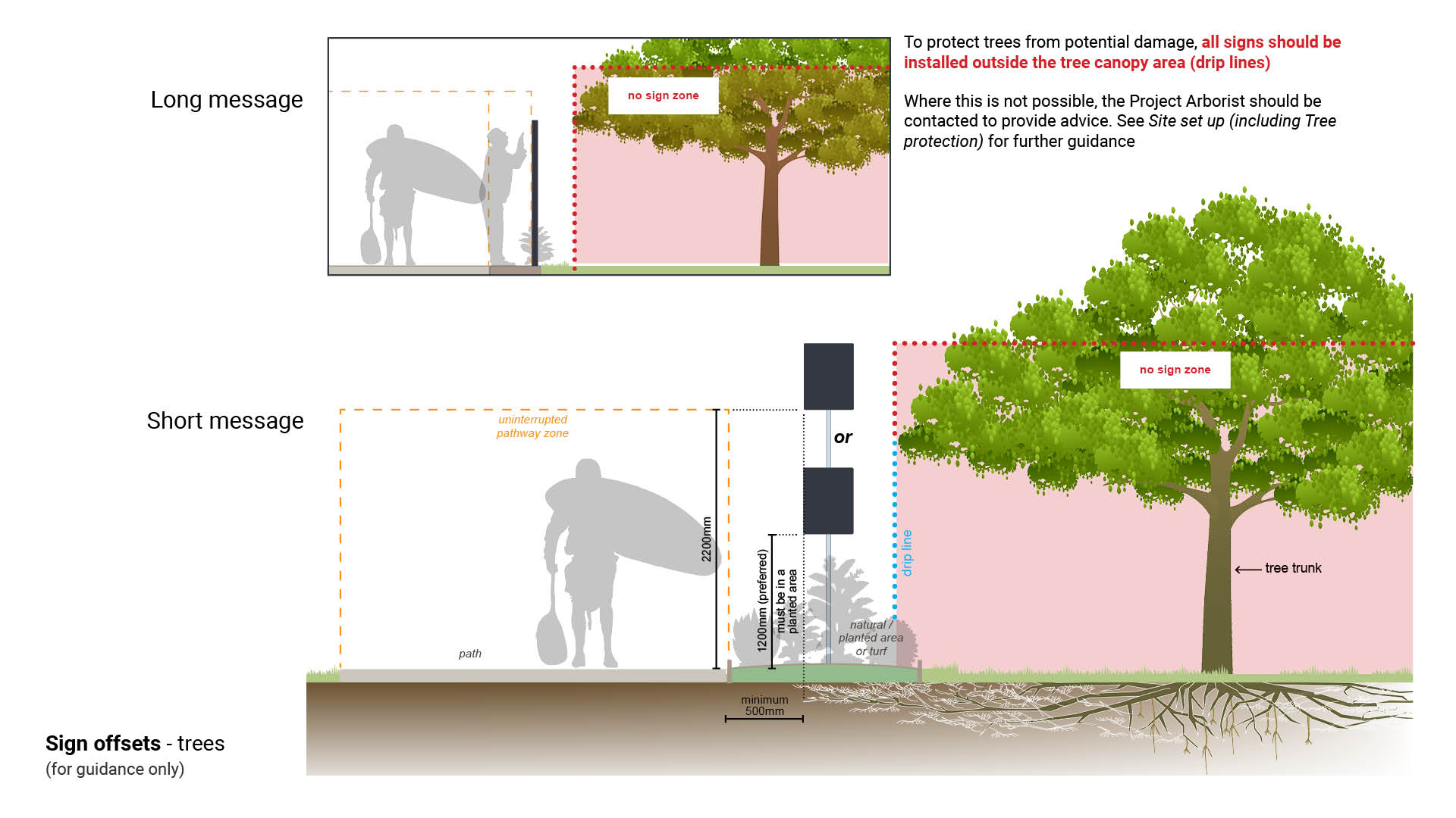 - To protect trees from potential damage, all signs should be installed outside of their canopy areas (drip lines). Where this is not possible, the Project Arborist should be contacted to provide advice. See LIM Site set up (including Tree protection).