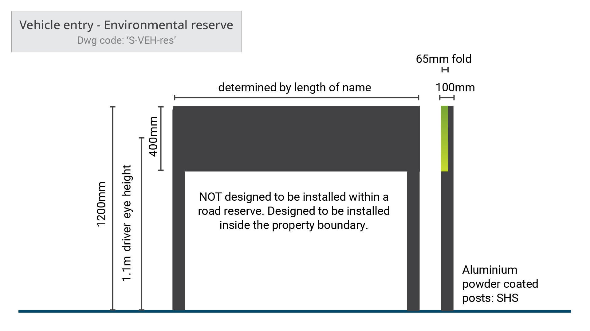 Note: The Vehicle entry sign for vehicles is NOT designed to be installed within a road reserve. The sign is designed to be installed inside the property boundary. Where the sign is installed within a road reserve, the sign must comply with the MUTCD and DTMR Guide to Roadside Signs.