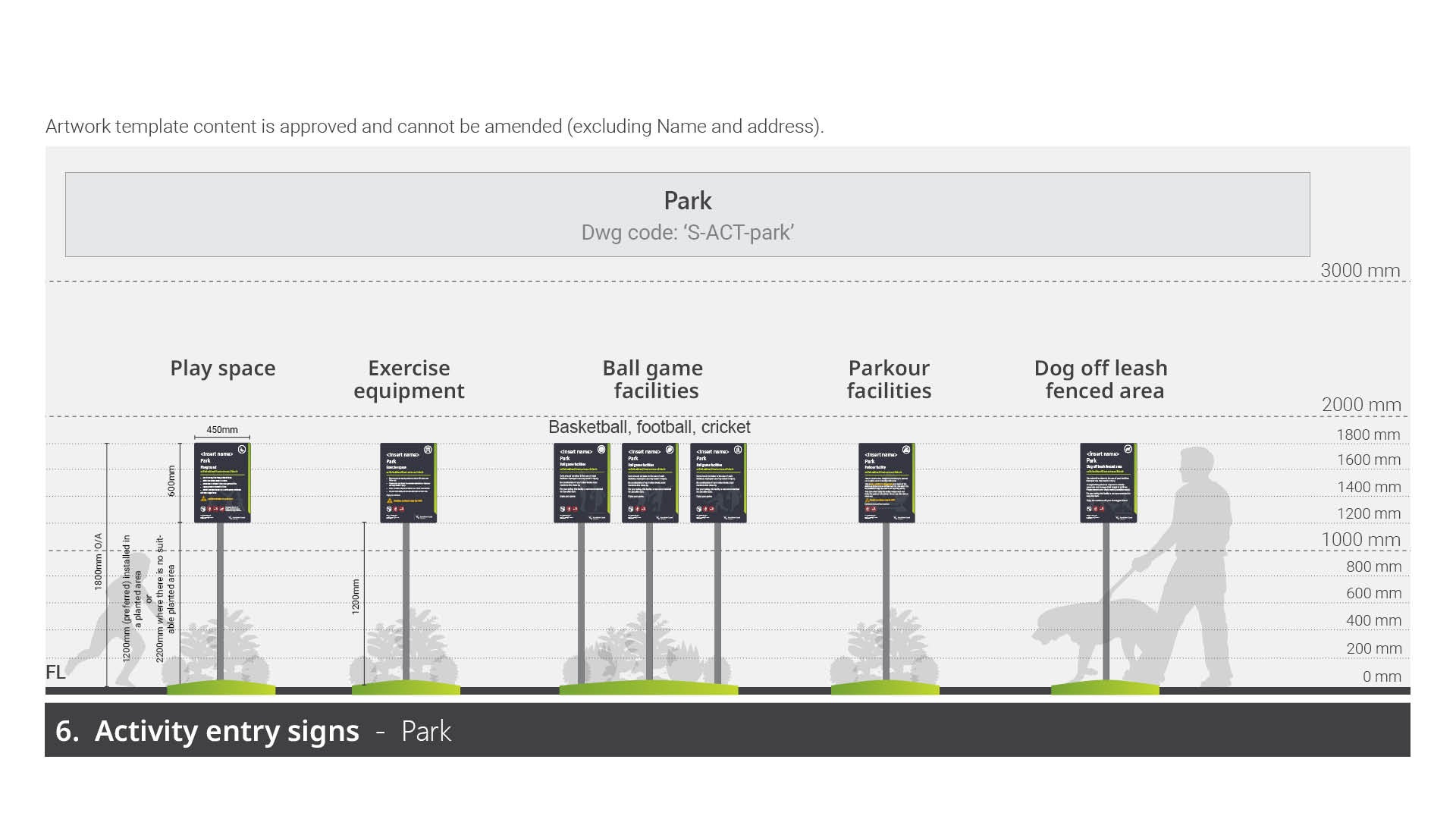 This type is to be installed in only park locations at a determined entry point for specialised use facilities within a park, such as playgrounds/play spaces, exercise equipment nodes, ball game facilities, dog off leash parks and skate parks. This sign type may also be referred to as Park user sign.