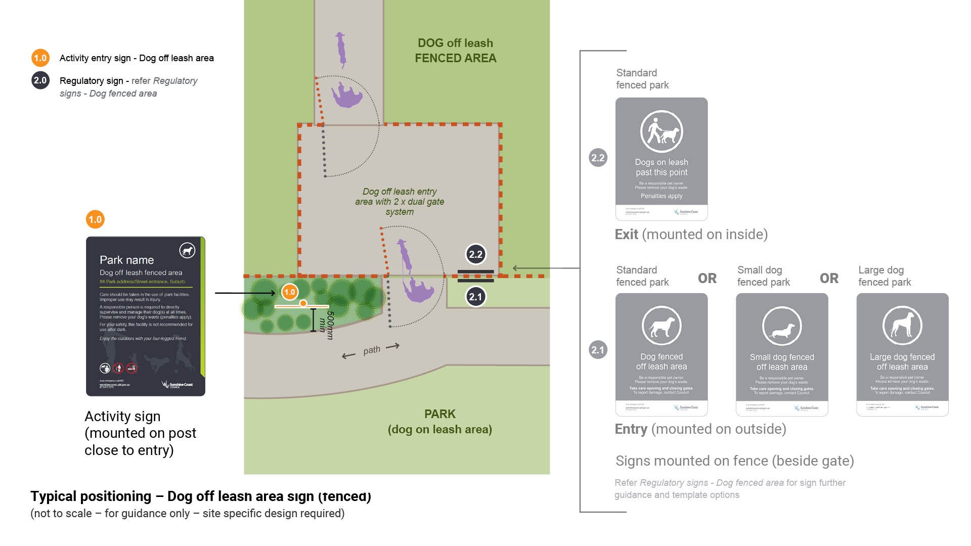 - Where the dog off leash area is unfenced, position the sign at primary entry points (preferred in a garden bed), a minimum 500 mm Austroads safety offset from any path of travel.