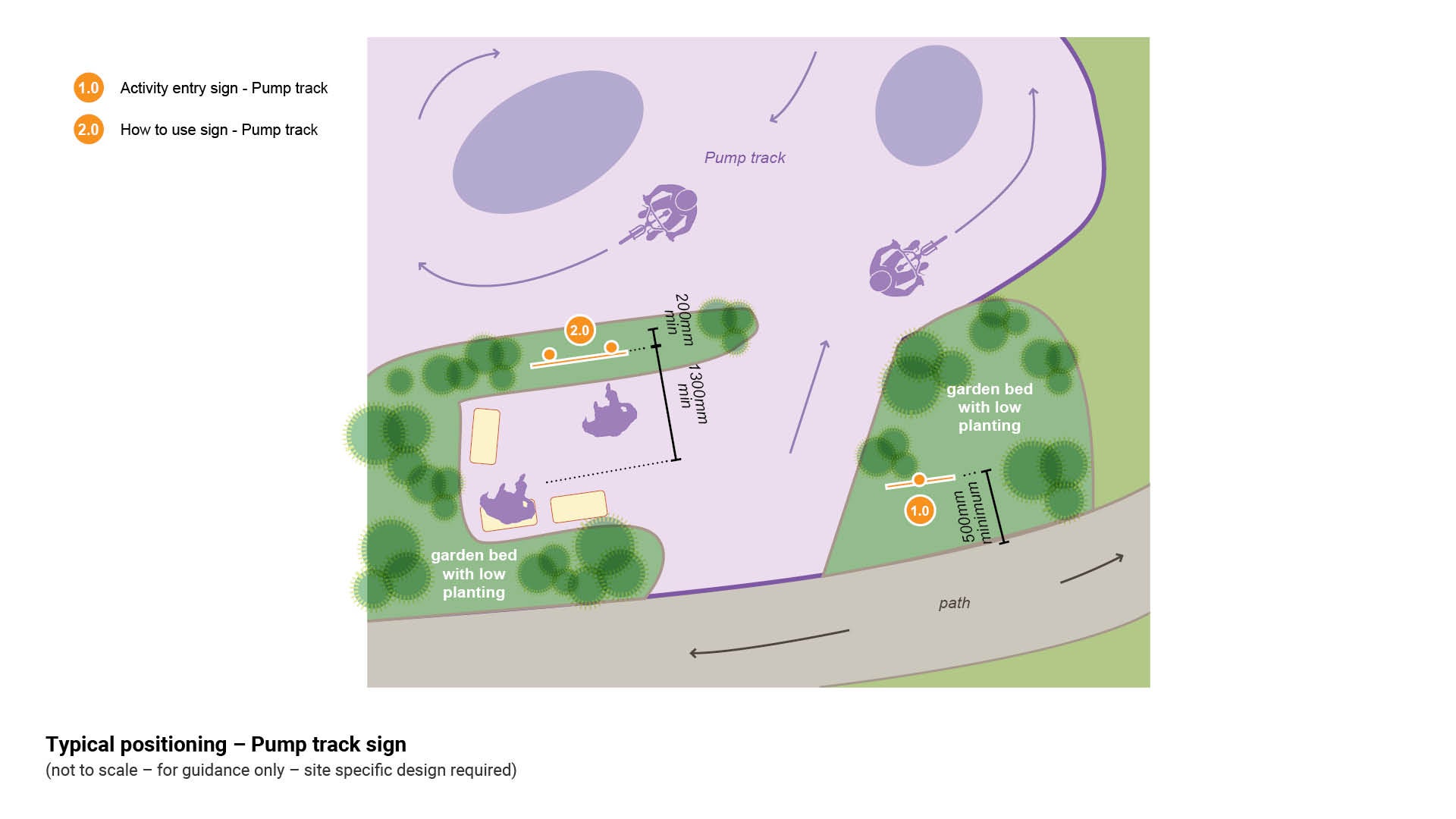- Activity entry signs for a pump track facility should be positioned in a garden bed beside the connection pathway, as close to the entrance (preferred). Or alternatively, positioned at the most used entry point of the facility as possible.