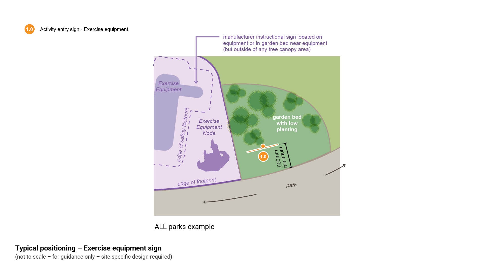 The supply and install of instructional signs is the responsibility of the exercise equipment or playground equipment manufacturer/certified installed. All signs must be fixed/installed at the time of installation.