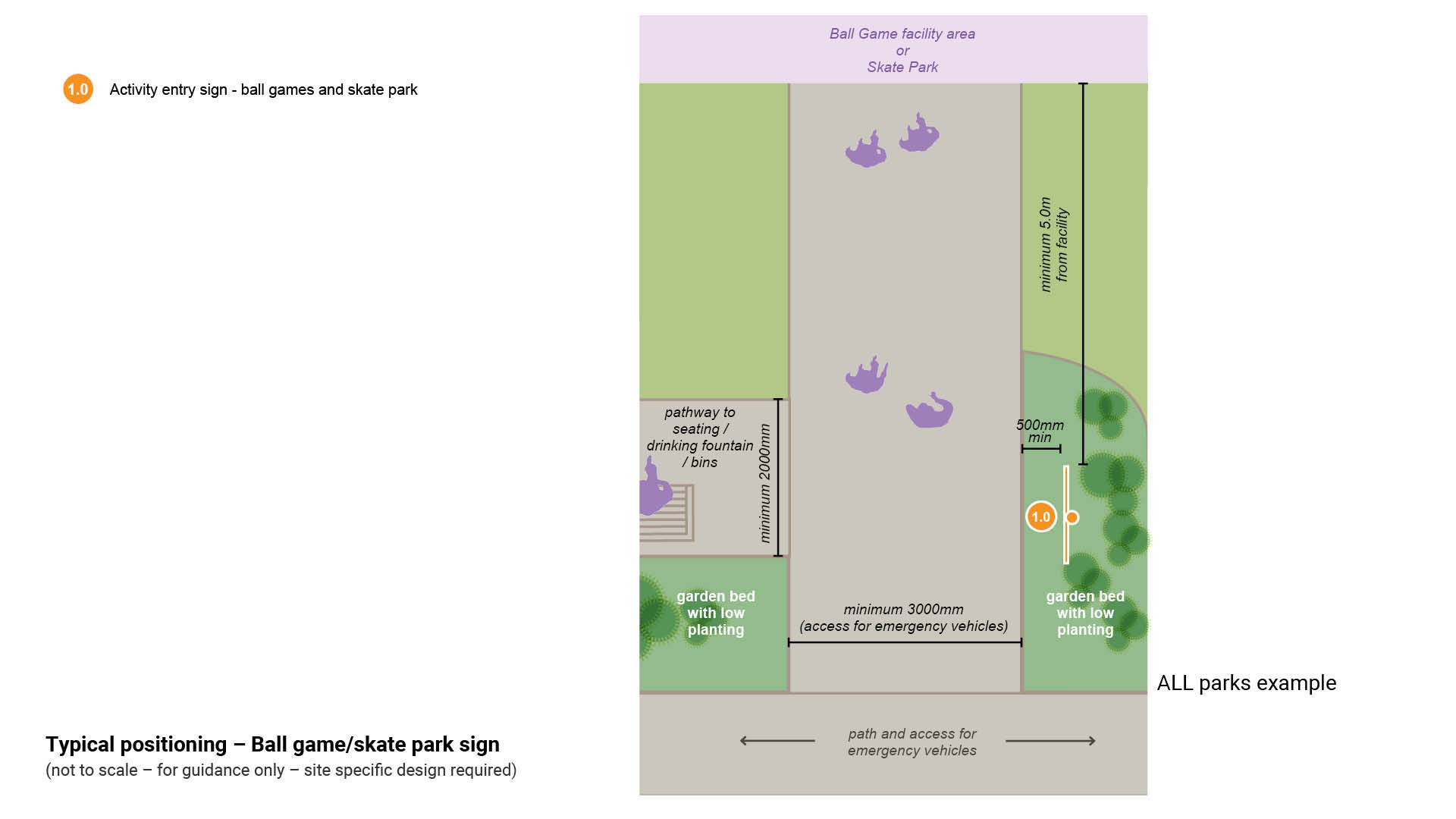 See Figure 18: Typical positioning – Ball games/Skate park sign.