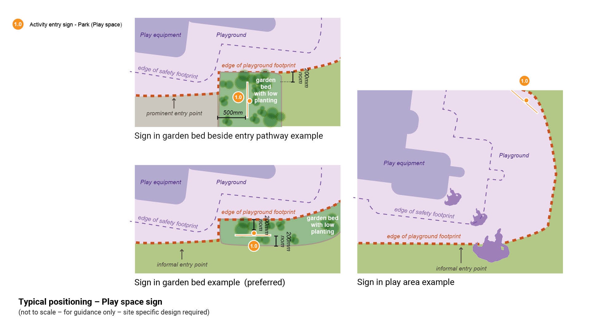 - Activity entry signs for playgrounds/play spaces should be positioned in a garden bed beside the pathway, as close to the entrance (preferred). Or alternatively, positioned at the most used entry point of the facility as possible.