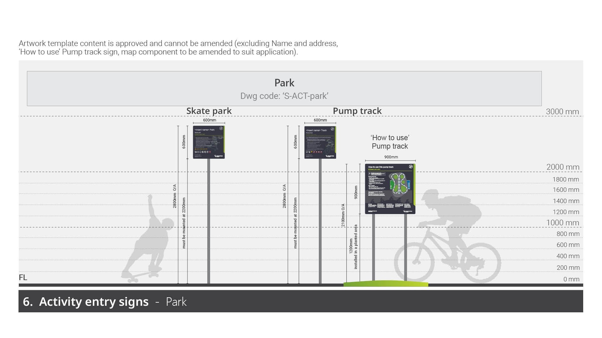 Activity entry signs are an internal entry sign located at an entry point to a activity within a public open space. The sign is intended to minimise risk, inform and enhance visitor experience. The content combines naming, specific safety and regulatory information pertaining to the activity undertaken in the immediate vicinity.