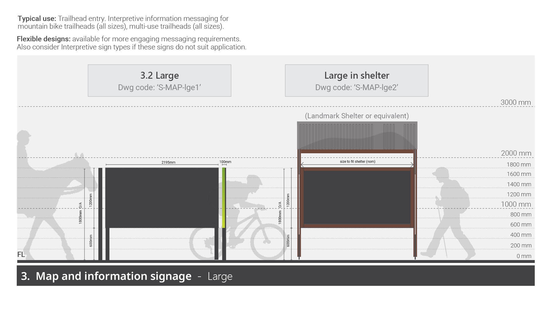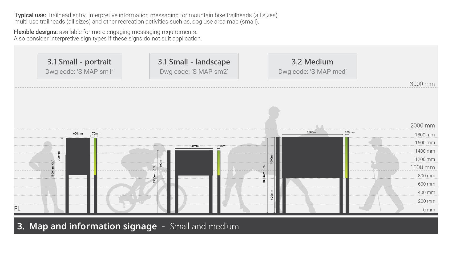 - To provide consistency within the trail network, additional Map/information signs must be of similar height and match the main Map and information sign. The user should recognise the uniformity of each sign when viewed separately along the trail.