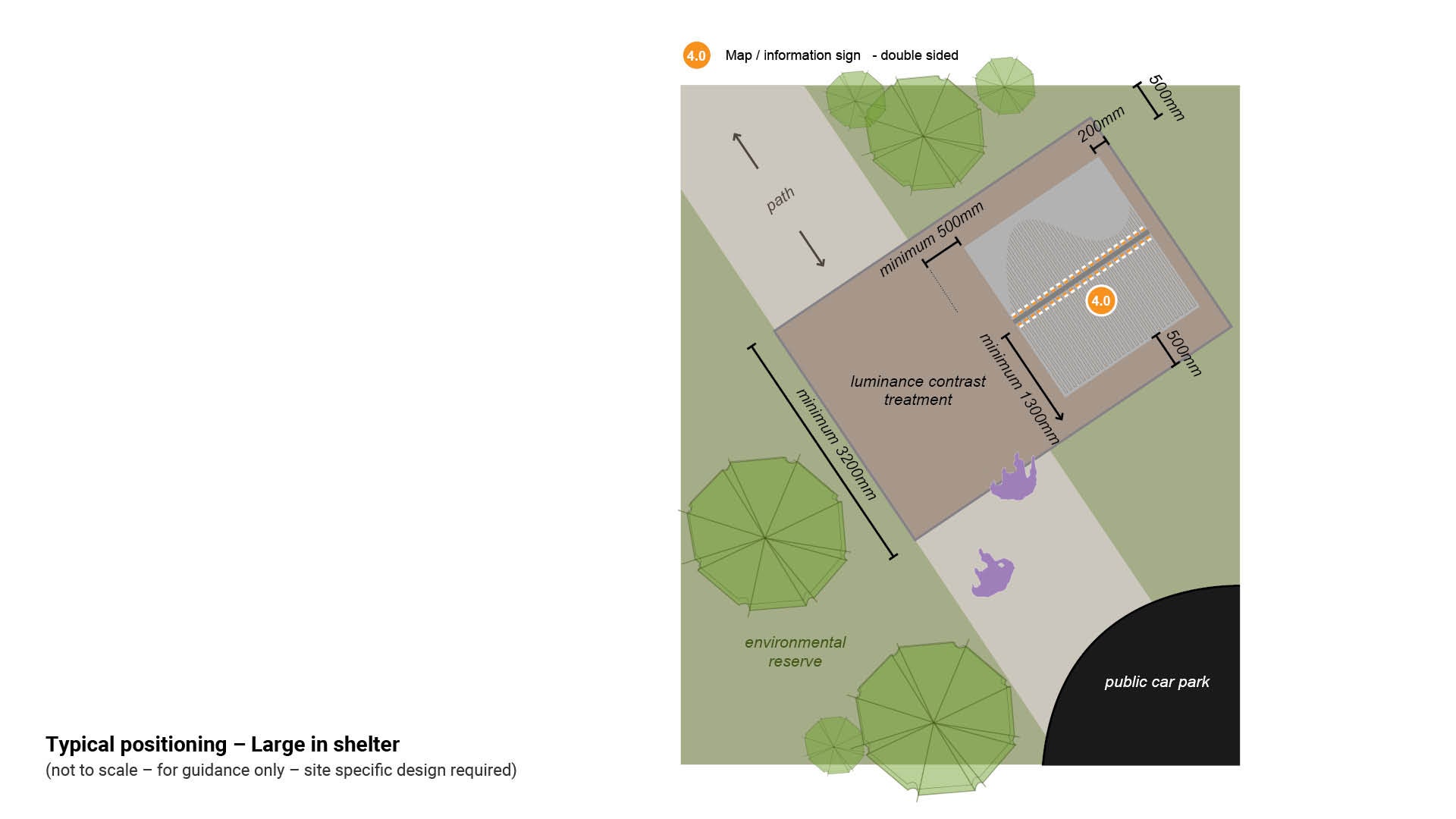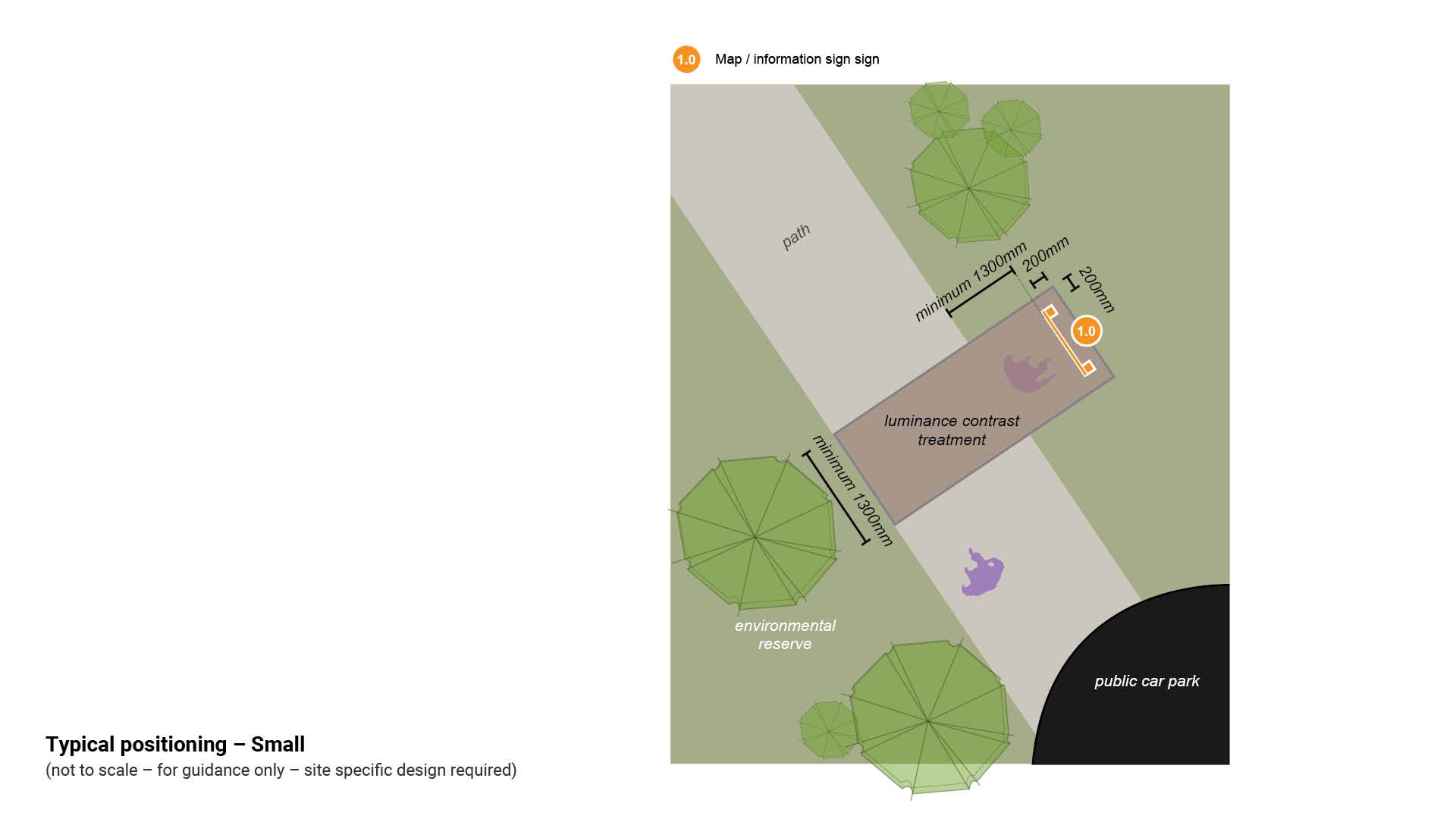 - Due to the size of these signs, incorporate an appropriately sized additional slab or compacted surface treatment area minimum 1.3 m off the pathway. This provides space for a wheelchair or group of people, to position in front of the sign while avoiding obstructing the path of travel.