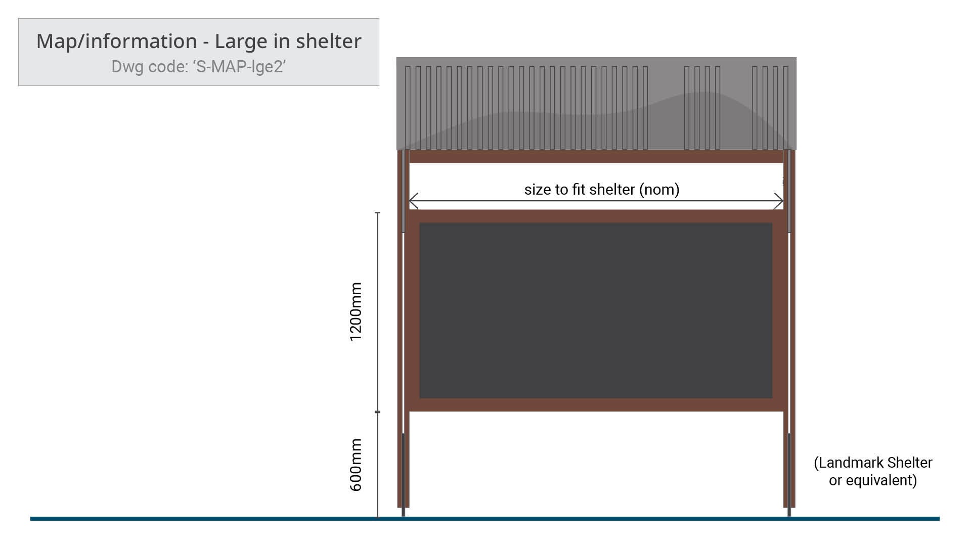 - When installing a shelter to house a Map/information sign, and the content does not require a double sided display, consider co-locating the sign with a Noticeboard. See Noticeboard for further guidance.
