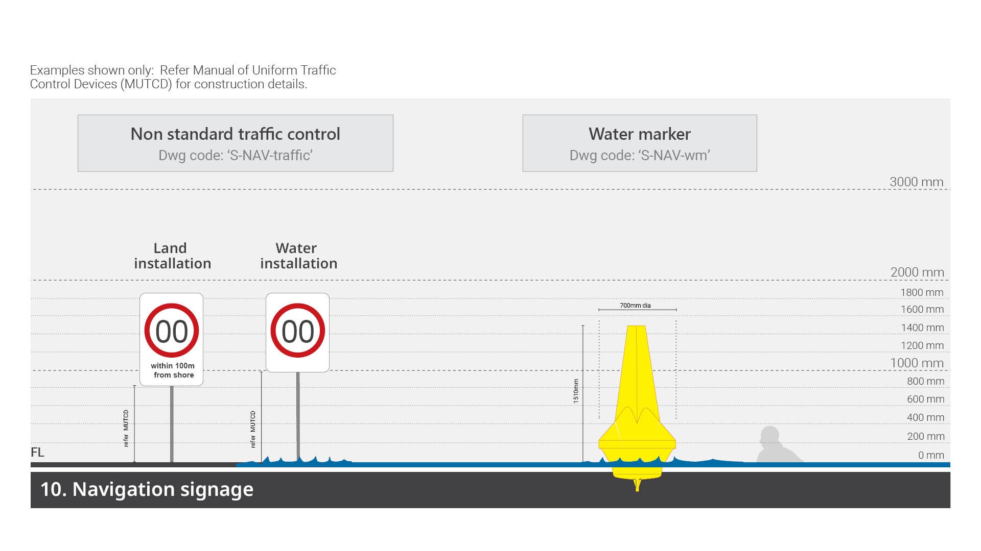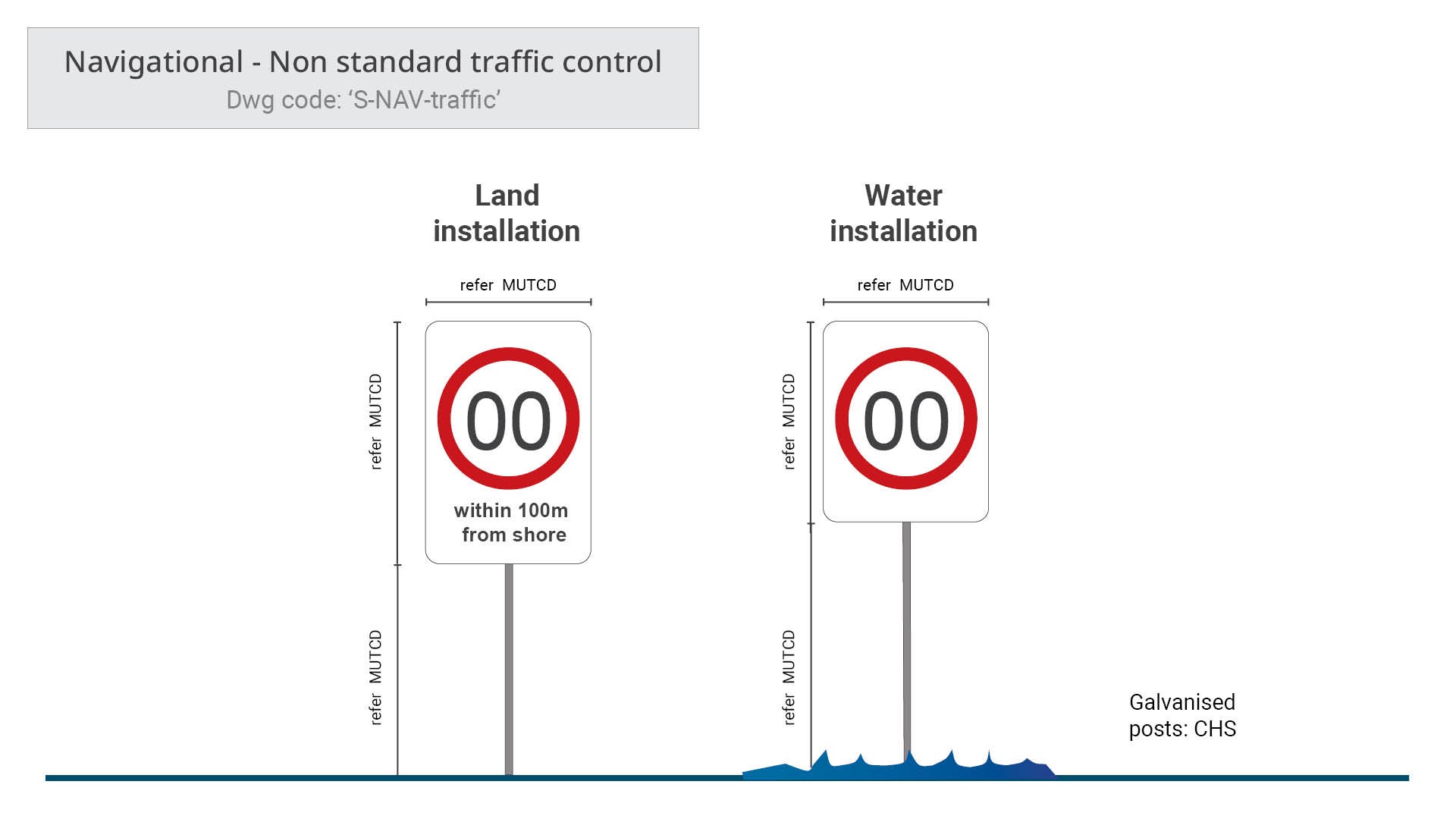 Non standard traffic control signs – used at boat ramps, pontoons, access points and associated environments. These signs can be used on both land and in water.