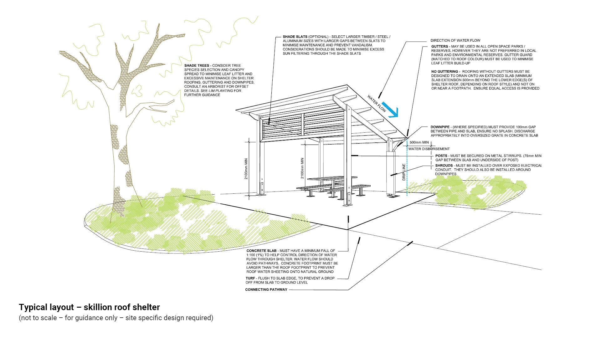 - To minimise leaf litter and excess maintenance on shelter roofing, guttering and downpipes, consider mature tree canopy spread and prevailing wind direction.
