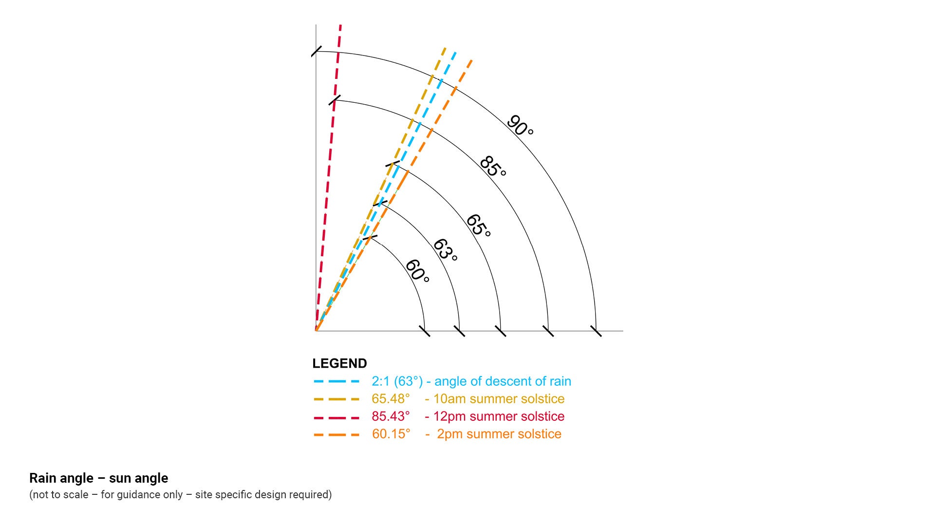 Note that the adopted rain angle allowance of 60° is a concession between 10 am - 2 pm shade cover (60.15° at summer solstice) and driving rain (63°).