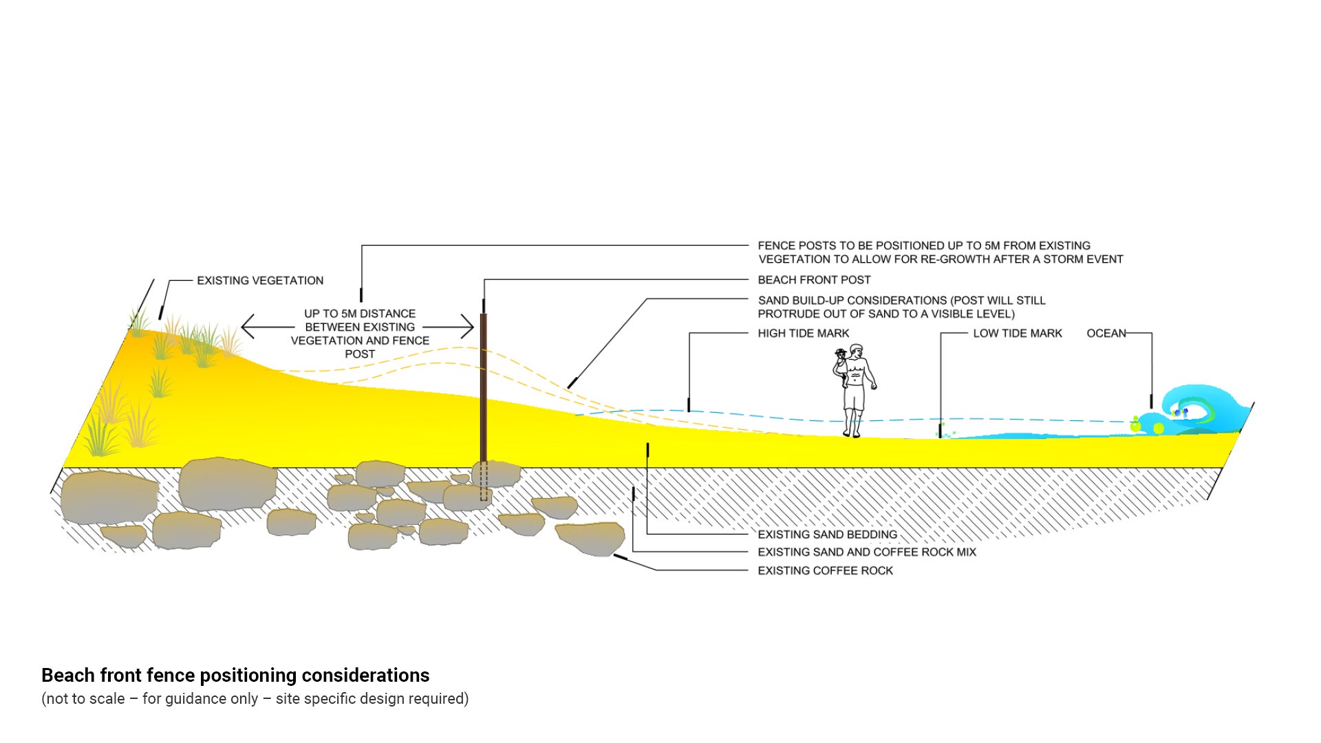 - The location of beach front fencing must consider high and low tides and storm surge levels. Fences positioned with these considerations will increase the useful life of the fence and reduce maintenance.