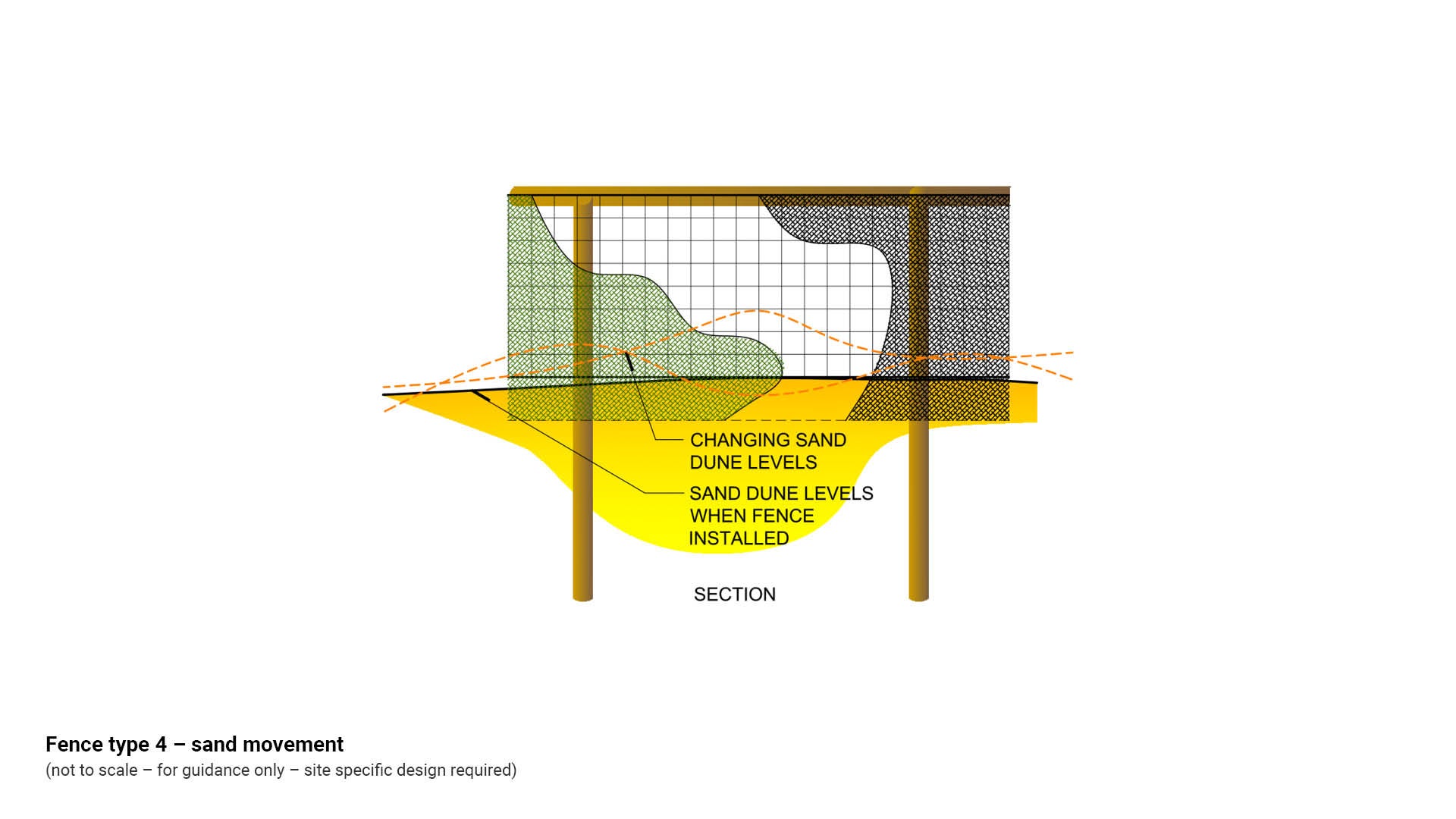 - Consider the alignment of the fencing and access to minimise sand encroaching adjacent open space and / roads during high winds.