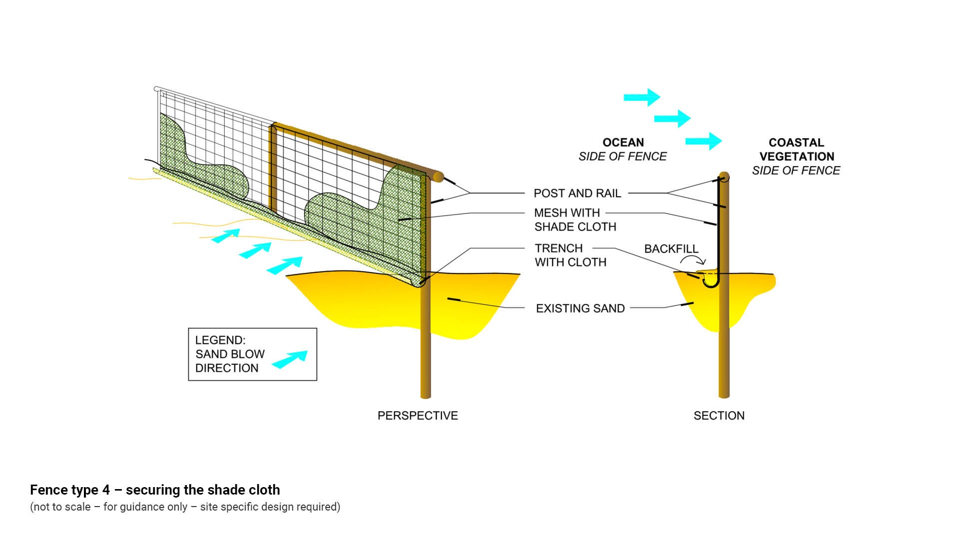 - The knitted shade cloth is positioned on the ocean side of the fence. This maximises sand catching. The sand builds up on the fence ocean side and the fabric limits sand from penetrating through the fence.