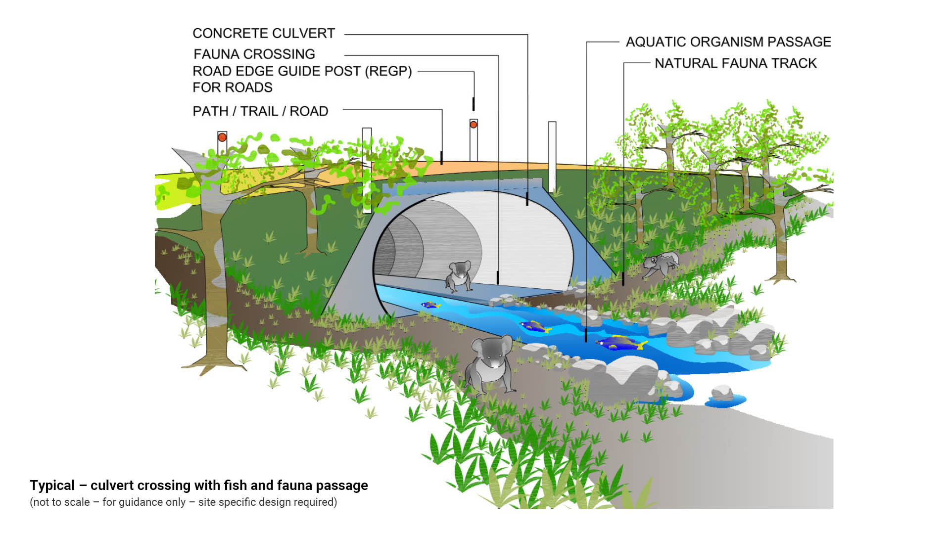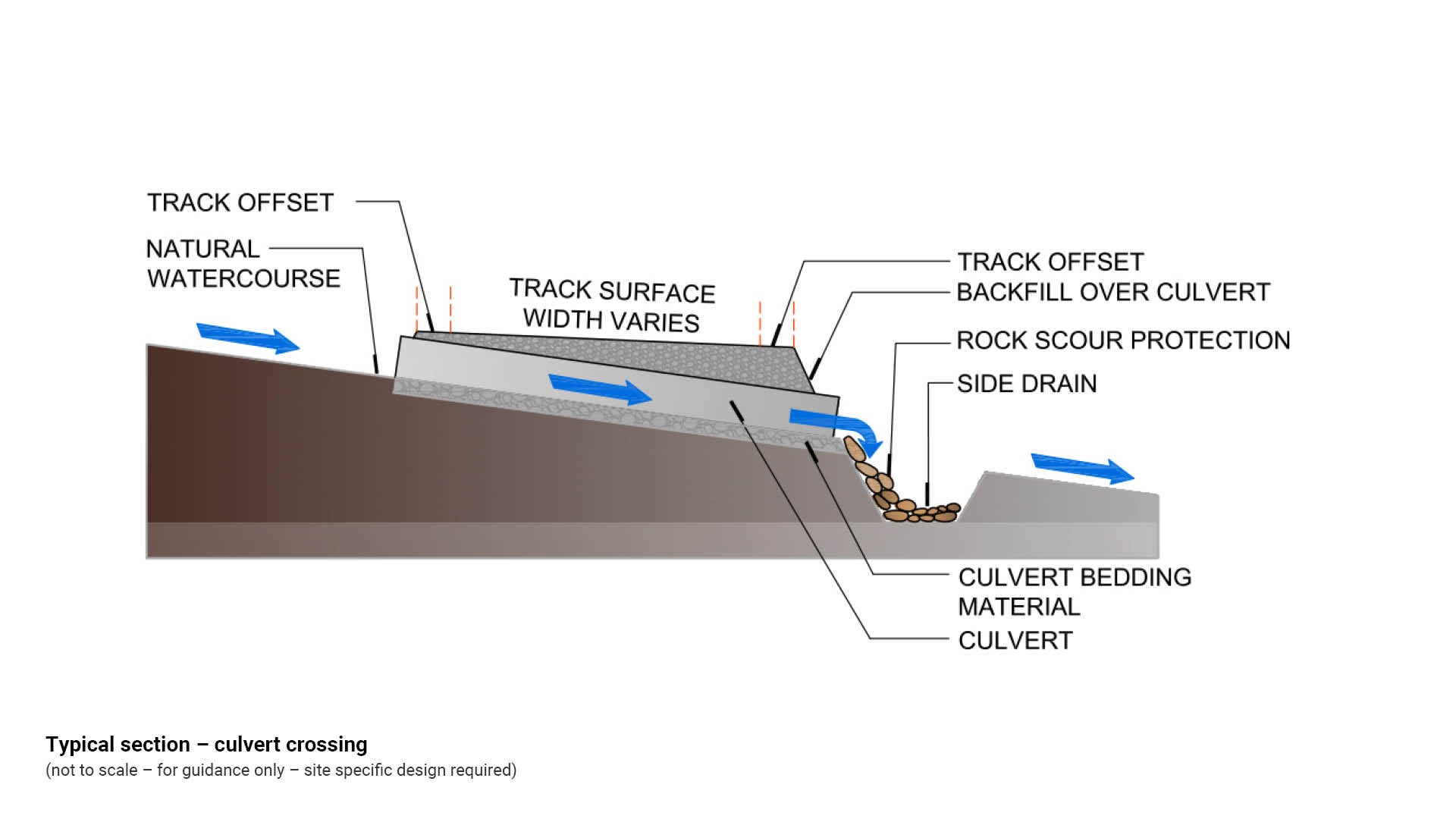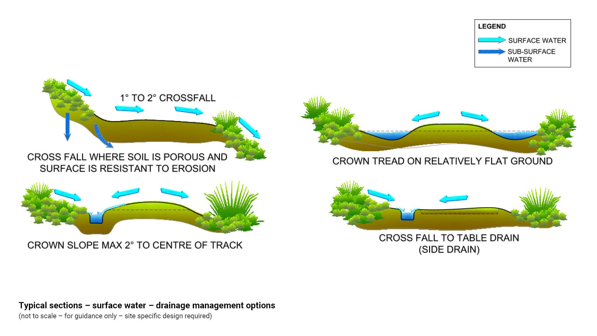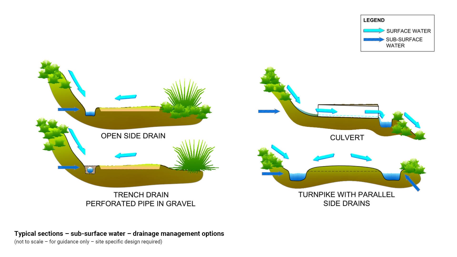 - Location of surface and subsurface drainage should be clearly indicated on design drawings, including the nominal depth and width.