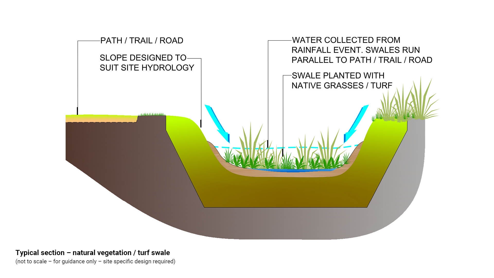 A swale drain is a shallow channel designed to convey stormwater and is usually lined with turf or natural vegetation. The objective of a swale drain is to minimise the use of piped stormwater drainage systems and ensure overland flow paths are retained in the catchment helping to minimise risks during peak rainfall events. Key swale considerations include: