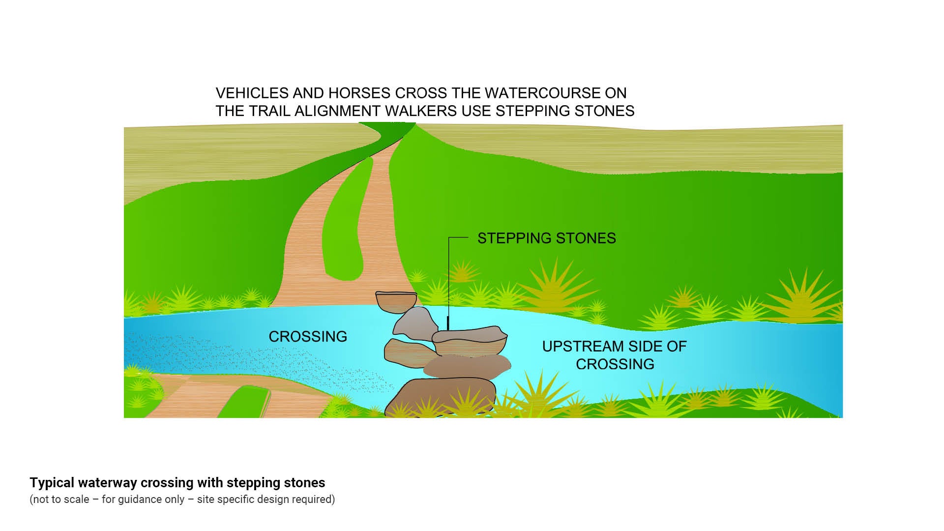 - Design a whoa boy to ensure natural cross flow of water is maintained and is not diverted down the path/ trail/road