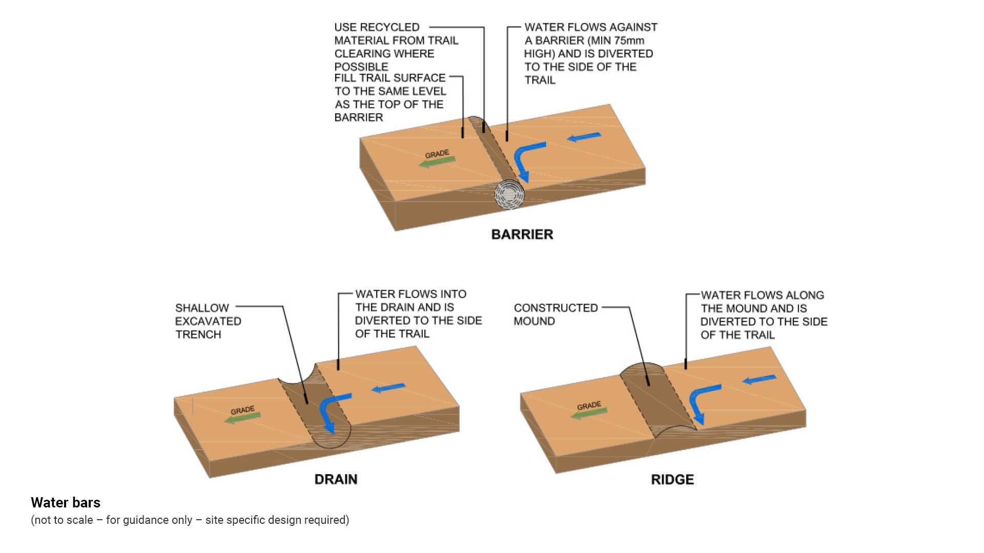 - Water bars are used to divert surface water which would otherwise flow down the trail reaching destructive energy levels.