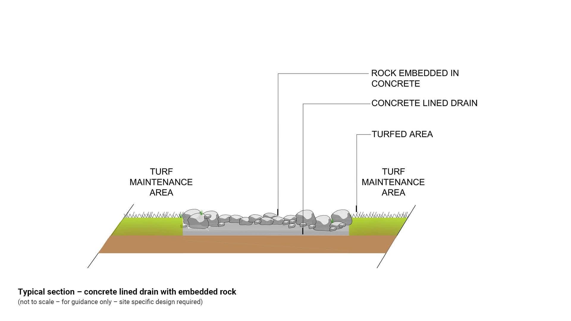 Rock lined drains should include a low planted buffer area both sides of the drain. Buffer planting separates loose rocks and turfed areas to prevent rocks becoming missiles when grass cutting or lawn mowing equipment is being used.