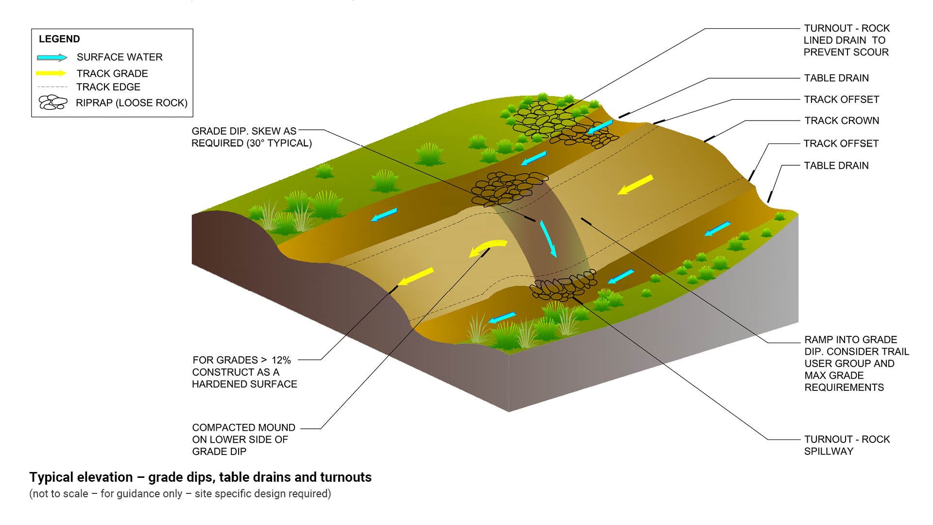 - Longitudinal grades should typically be between 1% and 4%