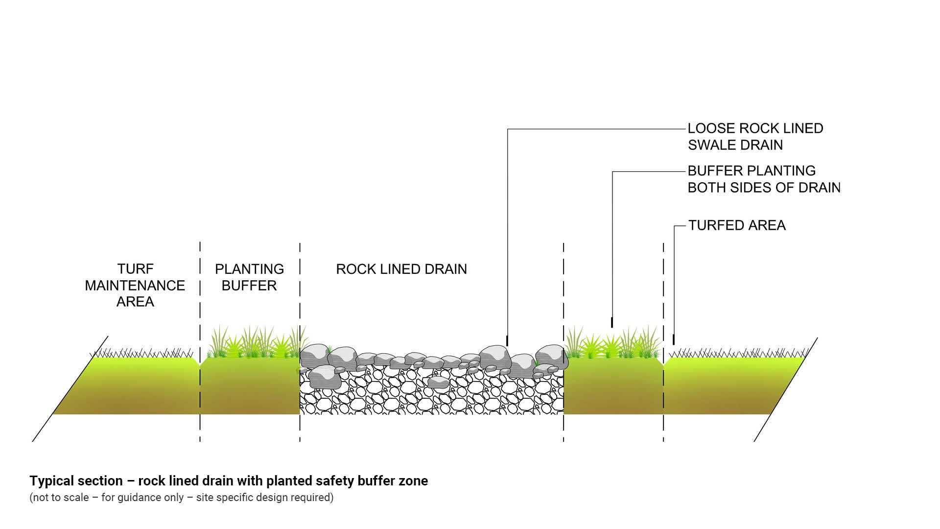 - Any loose rock lined drain should include a low planted buffer area both sides of the drain. Buffer planting separates loose rocks and turfed areas to prevent rocks becoming missiles when grass cutting or lawn mowing equipment is being used