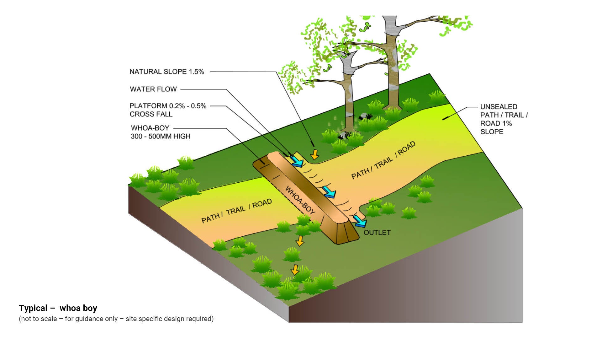 - Design a whoa boy to ensure that no rain water will flow down the path/trail/road