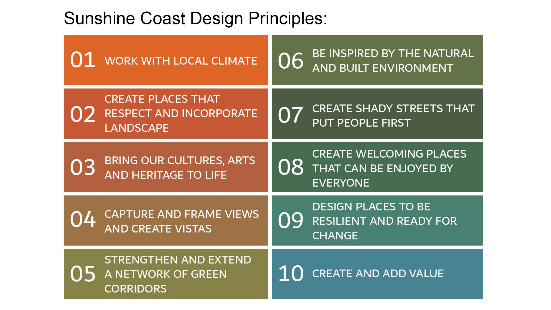 Sunshine Coast Design contains 10 design principles that guide good project planning and design outcomes, that are appropriate for the Sunshine Coast.
