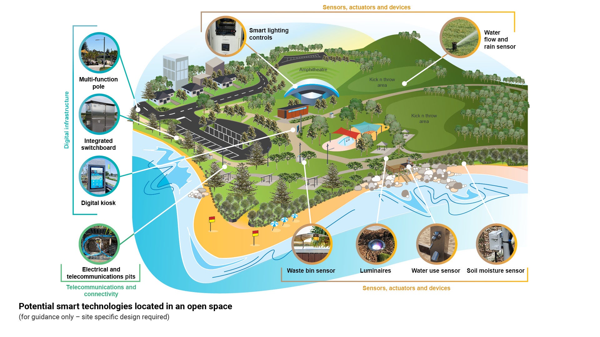 - Foundational infrastructure such as optic fibre and wireless connectivity supports the use of multi-function poles and integrated switchboards that provide power and wireless connection for the sensors and actuators used within open spaces.