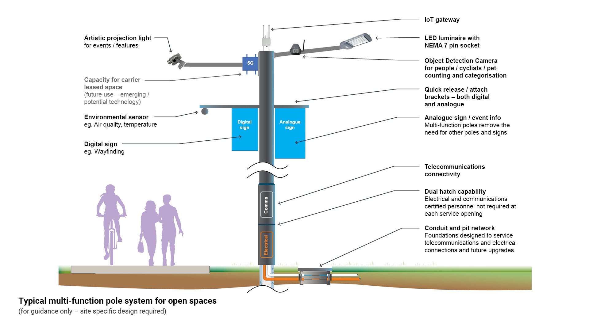 - Poles are connected to power and optic fibre at the time of installation to allow for smart technologies to be added over time, or for specific events.
